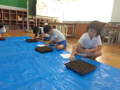 まずは1・2年生。セルトレイにパンジーの種をまきました。