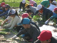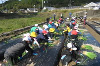 こちらは、6/13(木)に行われた4・5・6年生による田植えの写真です。暑い中でしたが、田んぼ特有の土の感触に、みんな楽しそうに植えていました(^^♪