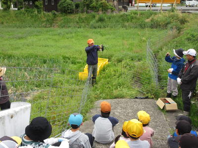 全児童で一斉に収穫開始。 「先生!獲れました!!」「大きいね(^_^)b」