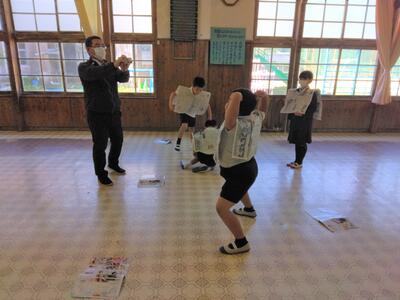 1年生と2年生合同で図工をしました。新聞紙がいろんな物に変身します。