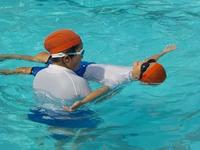 こちらが着衣水泳の様子です。3年~6年生までが服を着たままプールに入り、服が濡れた時の重さや、救助の方法を学びました。
