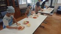 ピザづくり。出来上がりをイメージしてピザ生地に具をのせていきます。自分の食べるピザは自分でつくりましょう!