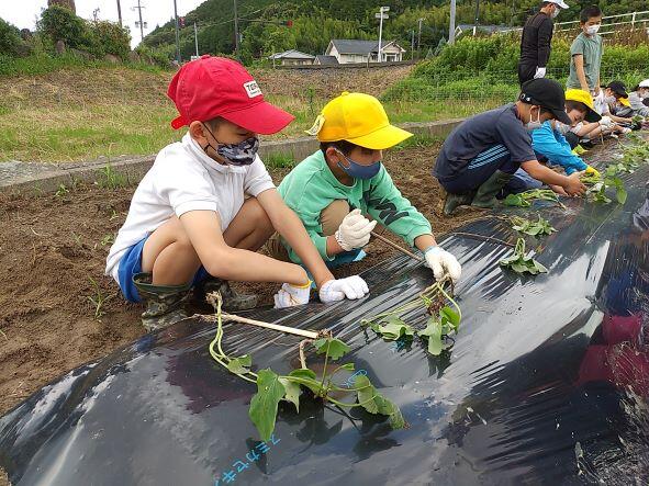 苗植えのベテラン6年生が苗の配置を決め、みんなで一斉に植えていきました。1年生に教える6年生、頼もしいですね!