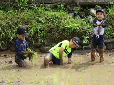 毎日の交通指導や田の管理されている石本さん、苗の提供や田植えの指導していただいたJAあしきたの本山さん、体験活動等でお世話になっている学校地域協働本部委員の岩本さんには、今回も大変お世話になりました。