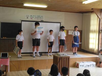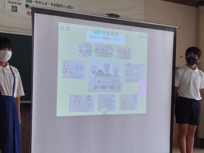 次に5・6年生から、学校キャラクターと人権宣言の2つの発表がありました。