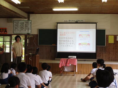 お昼休み後、「歯と口の健康集会」を実施しました。まず、保健室の谷口先生から、葛小っ子たちの歯の健康状態やむし歯の原因などについての説明がありました。「むし歯がなかった人は〇名です!」