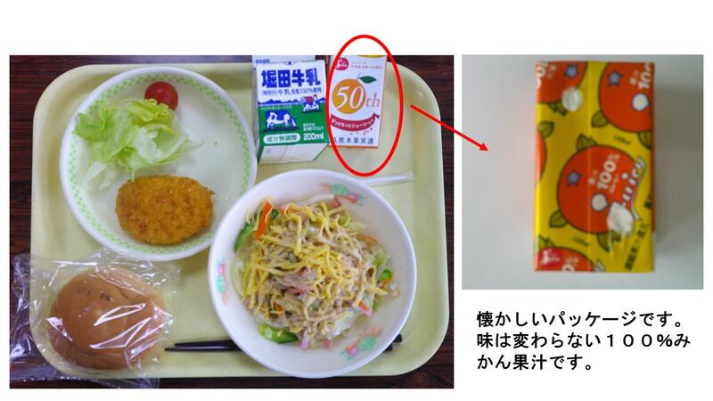 6月15日(木)は給食は上天草産のハモを使った「ハモの甘酢あんかけ」でした。上天草で捕れたハモは白身が柔らかくておいしかったです。また、26日(月)は果実連から50周年のジューシーをいただきました。懐かしいパッケージのジューシーで、熊本の味を堪能できました。
