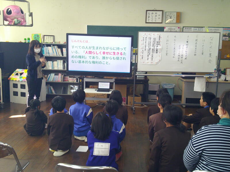 2月2日から6日までは「人権週間」です。本校では、3日(火)の業間の時間に、児童会主催の「なかよし集会」を行い、みんなで人権について考えました。集会では、「人権」とは 人を大切にし、思いやりの気持ちをもつこと であることをみんなで確認しました。また、「体が不自由な方との関わり方」をテーマにしたビデオを視聴し、なかよし宣言の唱和を行いました。子どもたちは、自分が日頃どのように周りの人と関わっているか、そしてこれからどのように関わっていくと良いのかについて、改めて考える時間となりました。