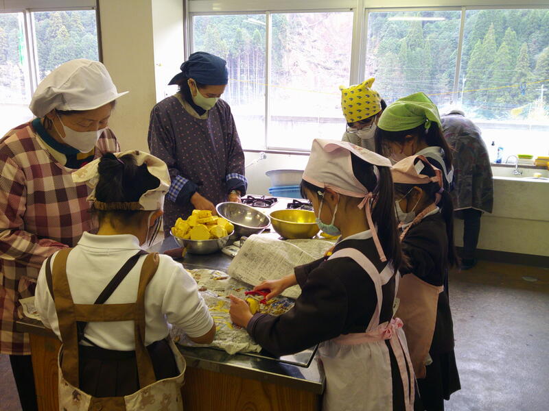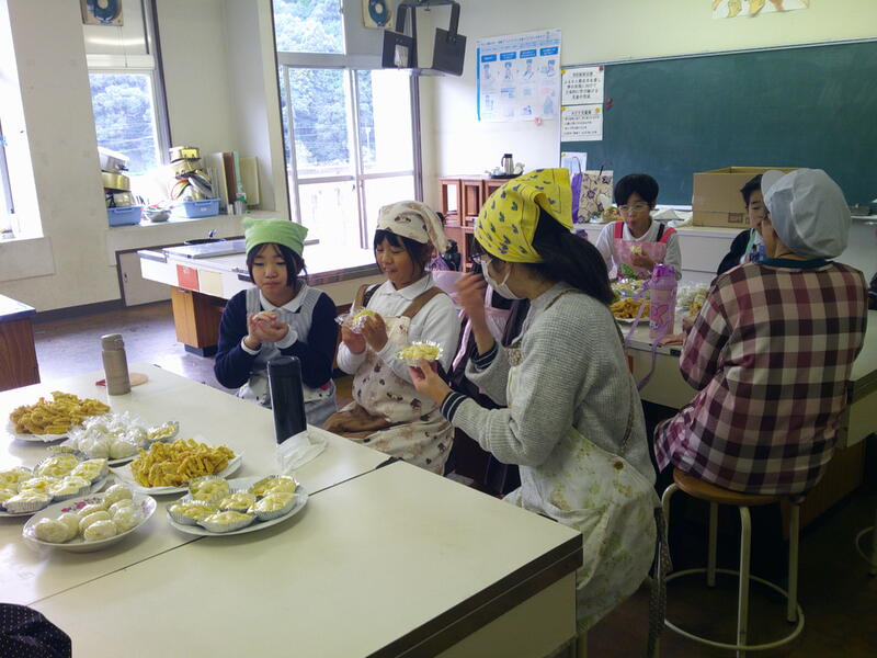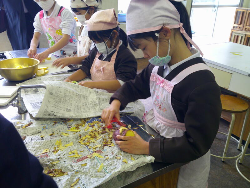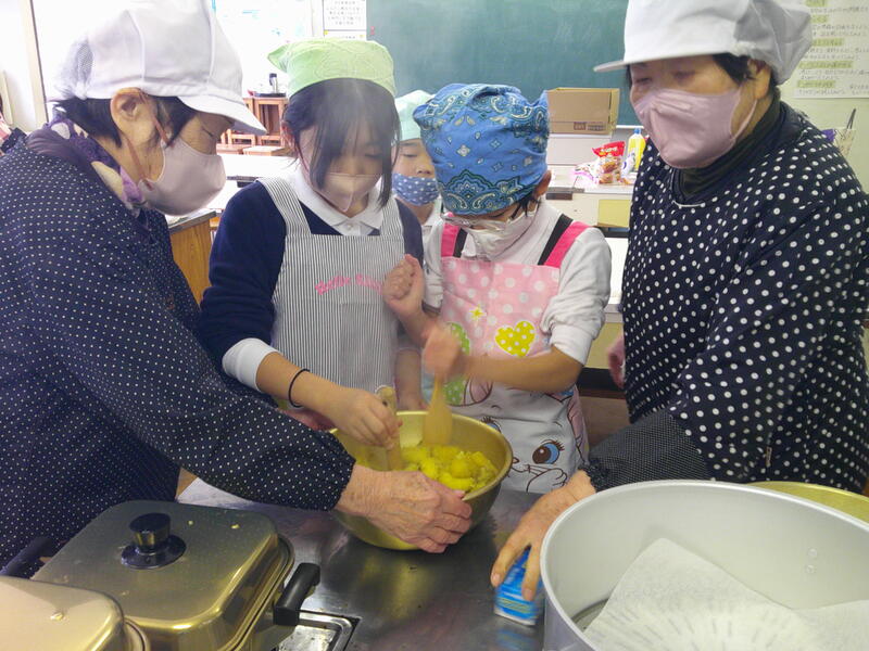 子どもたちが苗を植え、芋掘りをして収穫したサツマイモを使って、収穫祭を行いました。いも団子、いも蒸しケーキ、がねあげを地域の方に教えていただきながら作りました。参加したのは1~4年生です。芋が堅くて大変でしたが、指を切らないよう気をつけながら料理に挑戦しました。自分たちが育てた芋を使った料理なので、材料を大切に扱っていました。食べ物への感謝はもちろん、教えてくださった地域の方への感謝の気持ちも、最後にしっかり伝えることができました。