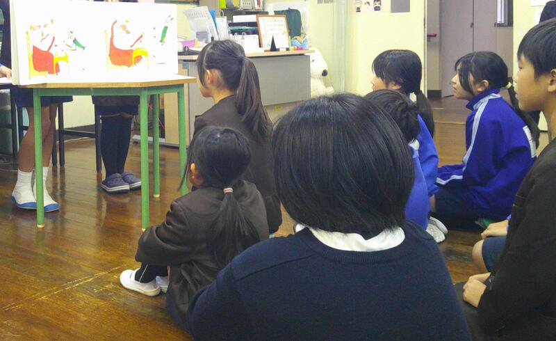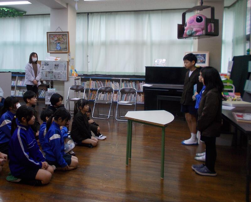 11月18日(火)業間の時間にお話集会をしました。秋の季候の良い時期ですので読書のきっかけになるように図書委員会の児童が読み聞かせをしました。「しりとりのすきなおおさま」という大型絵本でした。