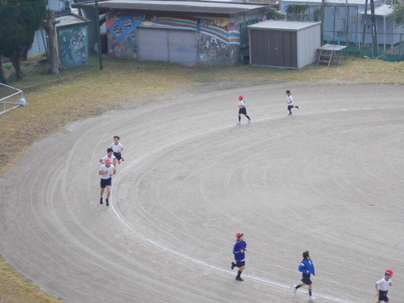 今年も持久走の季節がやってきました。12月18日の持久走大会に向けて、長距離走の練習が始まり、子どもたちは自分との戦いに挑んでいます。週に2~3回は大会コースを走るロード練習を行い、その合間には運動場で「5分間走」に取り組んでいます。