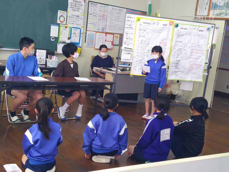 本校では毎週水曜日の朝自習に、3~6年生が合同で「トークタイム」に取り組んでいます。少人数のグループでテーマに沿って意見を発表し合い、質問を通して対話を深める活動です。最後にはどんな質問が出たかを振り返り、よりよい話し合いの力を育んでいます。今回は「無人島に行くなら何を持って行くか」がテーマ。生きるため・脱出するために必要なものを考えながら、子どもたちは楽しそうに意見交換をしていました。