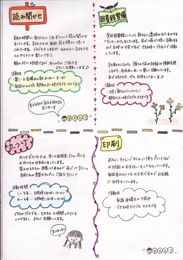 平成28年度の学校支援ボランティア募集のお知らせは、4月のPTA総会のころにお配りします。できるときだけの参加でかまいませんので、たくさん登録していただけると幸いです。また、活動時間や曜日は平成27年度のものですので、変更される場合があります。詳しくは後日配布するプリントをご覧ください。