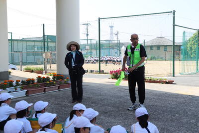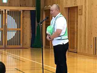 体育館では、全校児童へ防犯ボランティア体調の西居さんから