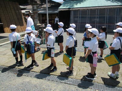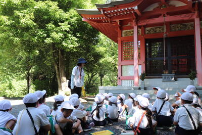 足湯公園から上って行った所に稲荷神社があります。たくさんの赤い鳥居をくぐり、神社に着くと、みんなでお参りをしました。2回目の町探検も晴天に恵まれ、貴重な体験ができました。