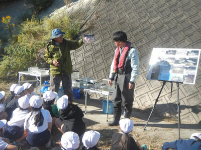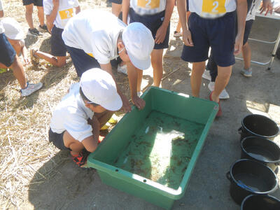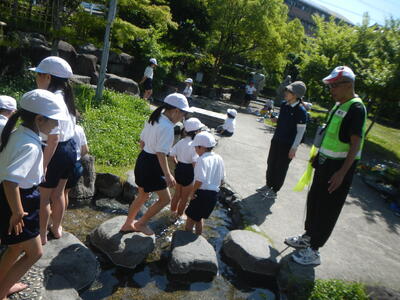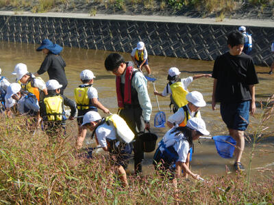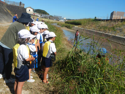 今年も、2年生の生活科の授業の一環として立願寺橋付近の繁根木川で校外学習が行われました。この活動は2年前、地域の民生委員の皆様のご支援により始められたもので、今年度からは、保護者の活動ボランティアの方々のご協力をいただき、継続して実施しています。