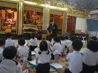 足湯、公園、稲荷神社の3カ所をクラスごとに探検しました。足湯では、みんな大はしゃぎで、あっちこっち歩き回っていました。お湯から上がる時には、足がピンク色になっていて、みんな楽しそうでした。