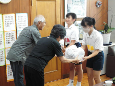贈呈式では、6年生の2名が児童代表として校長室で受け取りました。贈呈の際には、老人会長の山本順一様より「心を込めて作った雑巾です。町小の子どもたちが、心地よい環境の中でしっかり勉強できることを願っています。」と、温かい言葉をいただきました。