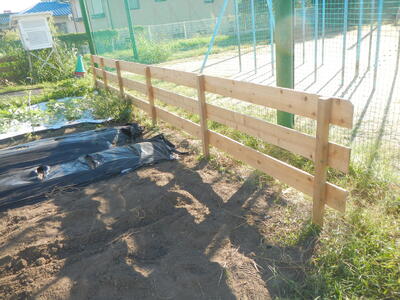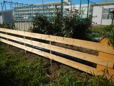 ひまわり学級の先生から、畑の周りに柵を作りたいという依頼がありました。そこで、昨年草置き場を作成していただいた、保護者でもある坂本さんにお願いをしたところ、快く引き受けてくださいました。金曜日の夕方に、現地で、場所や長さなどの打ち合わせを行ったところ、月曜日の朝には、もう立派な柵ができ上っていました。出来上がりのあまりの速さに、びっくりしました。おかげで、ひまわり学級の子ども達は、感謝の気持ちとともに、大切に野菜を育ててくれることでしょう。本当にありがとうございました。