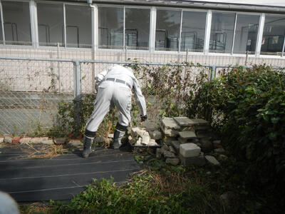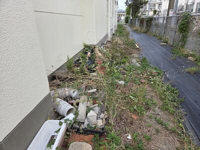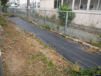 16日(木)に今月の環境整備ボランティア活動を行い、管理棟東側通路の整理を行いました。通路には破損したプランターや看板、使用しなくなった石やブロックなどがあったため、事前に地域の方に相談したところ、その廃棄物をご厚意で処理してくださいました。当日は、環境整備ボランティアの方にお手伝いをいただき、残った石やブロックはマルチ止めとして使いました。また、伸びた草も刈り、スッキリ片付けることができました。