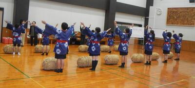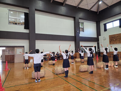 今年も、玉名大俵まつり「米俵積出の式」への出演に向けて、地元・高瀬に伝わる民謡「肥後俵積み出し唄」の踊りの練習が始まりました。今年度は、3年生から5年生までの有志児童12名が参加します。初めて参加する3年生は、少し緊張していましたが、みんな意欲いっぱいで初日の練習を終えました。