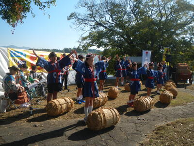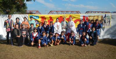 令和5年度から始められた、校区に伝わる民謡「肥後の俵積み出し唄」の踊りの伝統継承も、今年で3年目。今年も玉名町小の3年生から5年生までの有志13人が、11月16日(日)に行われた「玉名大俵まつり『米俵積出しの式』」で、踊りを披露しました。今年は、染色工芸家の下川冨士子さんに提供いただいた、玉名の伝統工芸品の「高瀬絞り」(日本最古の木綿絞りです)の法被を着て踊りました。
