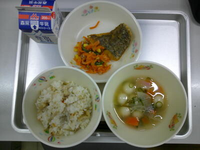 びりん飯(麦ご飯) 白玉汁 ホキのみかんソースかけ 人参サラダ 牛乳