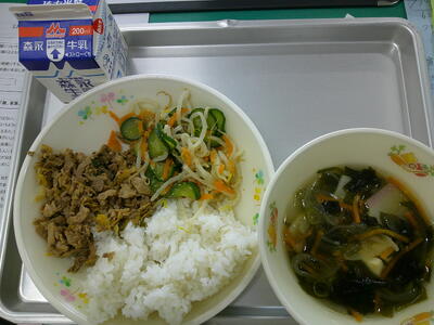 ビビンバ(麦ご飯) わかめスープ ビビンバの肉 もやしのナムル