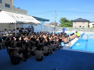 水泳学習の時に気をつけることとして、自分の家で朝の健康チェックをしてくること(おうちの人にしてもらうこと)、準備運動は汗が出るまでやること等を確認しました。
