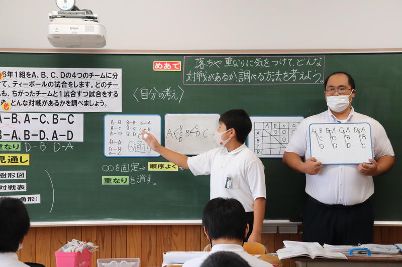 最後にそれぞれのグループで考えたことを発表しました。子どもたちは図や表を使って、様々な組み合わせ方を考えることができました。