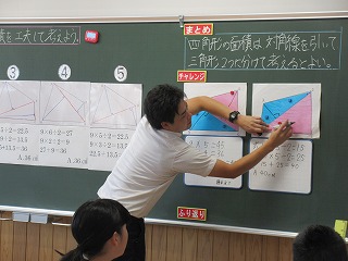 本時の目標:四角形の面積を2つの三角形に分割する考えを用いて、工夫して求めることができる。