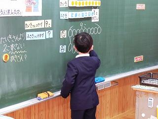 テープ図をもとに、ひかれる数とひく数、答えの関係を可視化しました。そして、ひき算の答えにひく数を足すと、ひかれる数になるというきまりを見つけ、たしかめ算に取組みました。グループや全体での話合いにおいて、積極的に意見を発表する子が多く、みんなで課題を解決しようという姿が見られました。