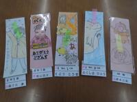 今日は、図書館整備ボランティアさんにしおりを作っていただきました。子どもたちが1つ1つ描いたしおりをラミネートし、けがをしないように周りを丸く切っていただいています。
