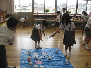 1年生とルーテル幼稚園の子どもたちを招待して、自分たちで作った手作りおもちゃを使って交流しました。