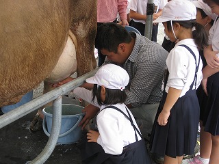 牛の乳搾り体験です。初めての乳搾りはとても緊張しました。