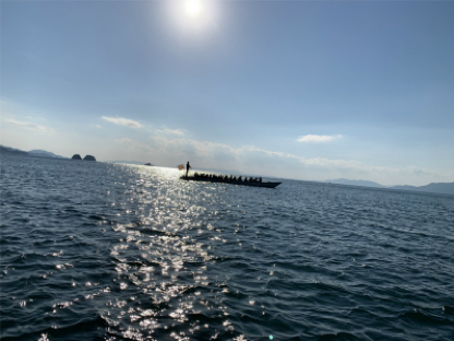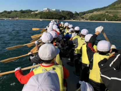 子どもたちはクラスごとにペーロン船に乗り、芦北の海へ漕ぎ出しました。