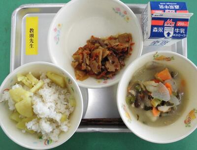 さつまいもご飯(麦ご飯) たけみつ公鍋 ヤーコンのきんぴら 牛乳