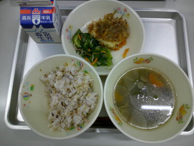 梅ちりご飯(雑穀ご飯) 根菜汁 揚げ出し豆腐 チンゲンサイのじゃこ和え 牛乳