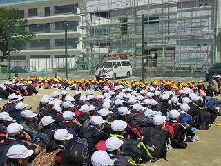 小運動場で、1年生の歓迎会を行いました。1年生の元気なあいさつの後、運営委員会の「町小クイズ」がありました。