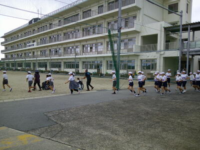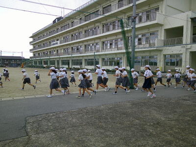 いざという時に速やかに避難できるようにするための訓練です。子ども達は地震発生の放送を受け、担任の指示に従ってグラウンドに避難をします。皆、頭を守るために帽子をかぶったり教科書を頭に載せたりしながら、黙って避難することができました。
