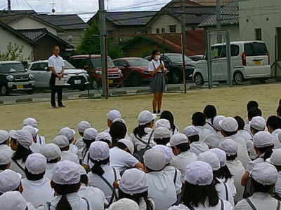 グラウンドに集合後、生活安全委員会主導で振り返り等を行いました。子ども達は改めて、『お(おさない)・か(かけない)・し(しゃべらない」)・も(もどらない)』ことの大切さ確認することができました。