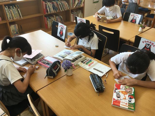 本の挿絵や本から得たインスピレーションをもとにしながら、台紙に下絵を描き、それを「しおり」にしていきます。制作中のどの児童も丁寧に取り組み、世界に一つだけのオリジナルの「しおり」を作っています。