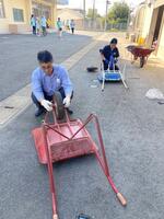 学校にある作業用一輪車のうち、半分はタイヤがパンクして使用できなくなっていたので、ノーパンクタイヤに交換をしました。ついでに外れかかっている荷台の応急処置も行い、全ての一輪車を使える状態に整備しました。
