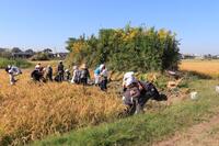 本校でも、「家庭でしつけ、学校で学び、地域で育てる」を合言葉に、地域学校協働活動に取り組んでいます。写真は、地域学校協働活動の一環で行った、ひまわり学級の稲刈りの様子です。