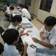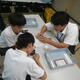 次に、作り方の説明を聞いた後、「光るポストカード」を実際に作り始めました。今回も、作る時は高校生がそばに付いて、声を掛けたり難しいところは少し手助けをしてくれたりして、それぞれのオリジナルポストカードができあがりました。子どもたちは、その後、スイッチを入れて、LEDライトの光る作品を見て、うれしそうでした。
