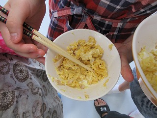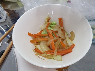 今回は、キャベツやにんじん等の野菜を持ち寄って、いためる調理にチャレンジしました。