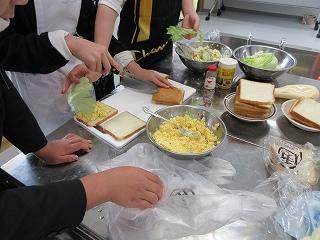 お世話になった先生方に感謝の気持ちを伝えるため、サンドイッチ作りをしました。
