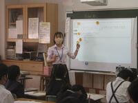約1か月の教育実習のまとめとして、教育実習生が査定授業を行いました。「分数のたし算・ひき算を広げよう」という単元で、分母の違うひき算の計算の仕方について考えを出し合いました。子どもたちは、