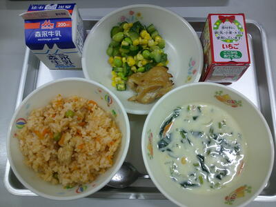 今日は、子ども達が大好きな「鶏のから揚げ」の登場です。調理中から、おいしそうな香りが漂っていて、子ども達は「早く食べたいな。」と思っていたようです。しっかりと下味がついていてとてもおいしかったです。