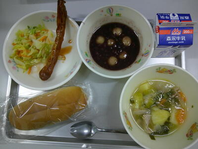 カットコッペパン ポトフ ウィンナー キャベツのレモン和え 白玉ぜんざい 牛乳